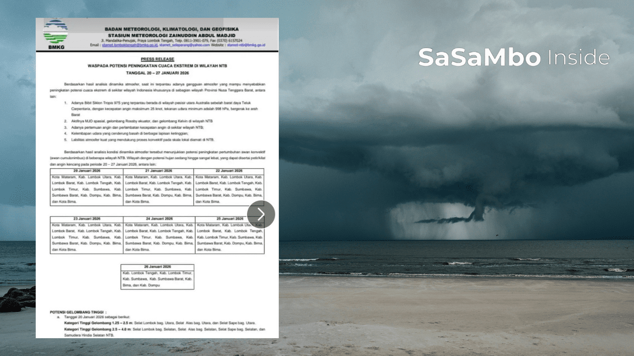 Samsamboinside.com – Ancaman cuaca ekstrem diperkirakan menyelimuti hampir seluruh wilayah Nusa Tenggara Barat (NTB) dalam sepekan ke depan.